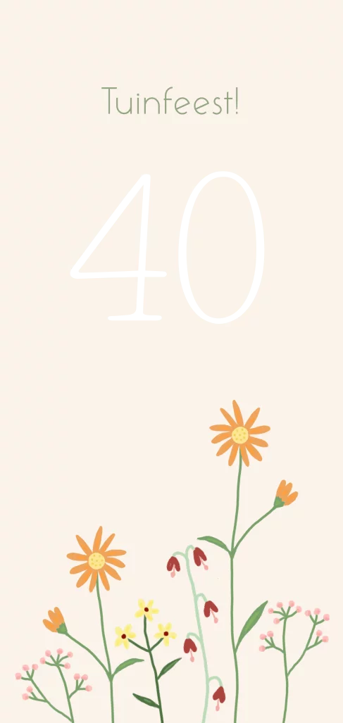 Een vrolijke verjaardagsuitnodiging met bloemen in frisse kleuren. Het jaartal 40 staat in goudfolie.