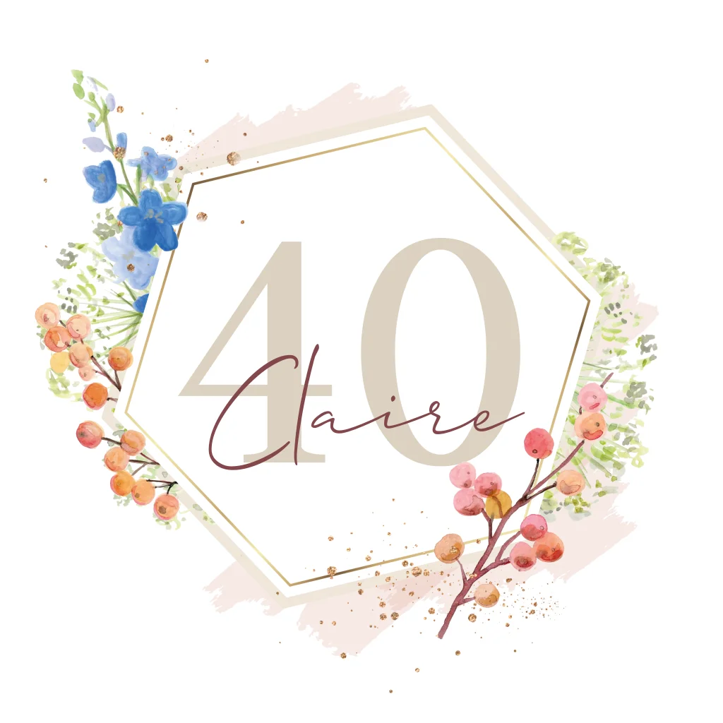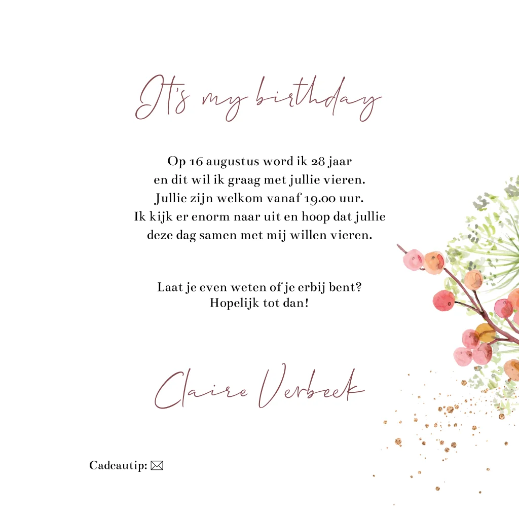 Uitnodiging voor een verjaardag met een kader in zeshoek met roze watercolor brushstrokes erachter en bloemen, takjes met besjes en spetters in goudlook erbij.
