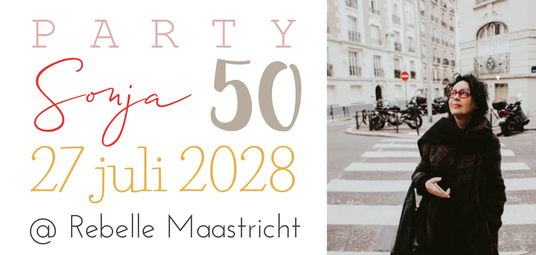 Een hippe verjaardagsuitnodiging voor een vrouw die 50 wordt. Leuk om een mooie foto op de kaart te plaatsen. Deze verjaardagsuitnodiging is eenvoudig zelf naar wens aan te passen.