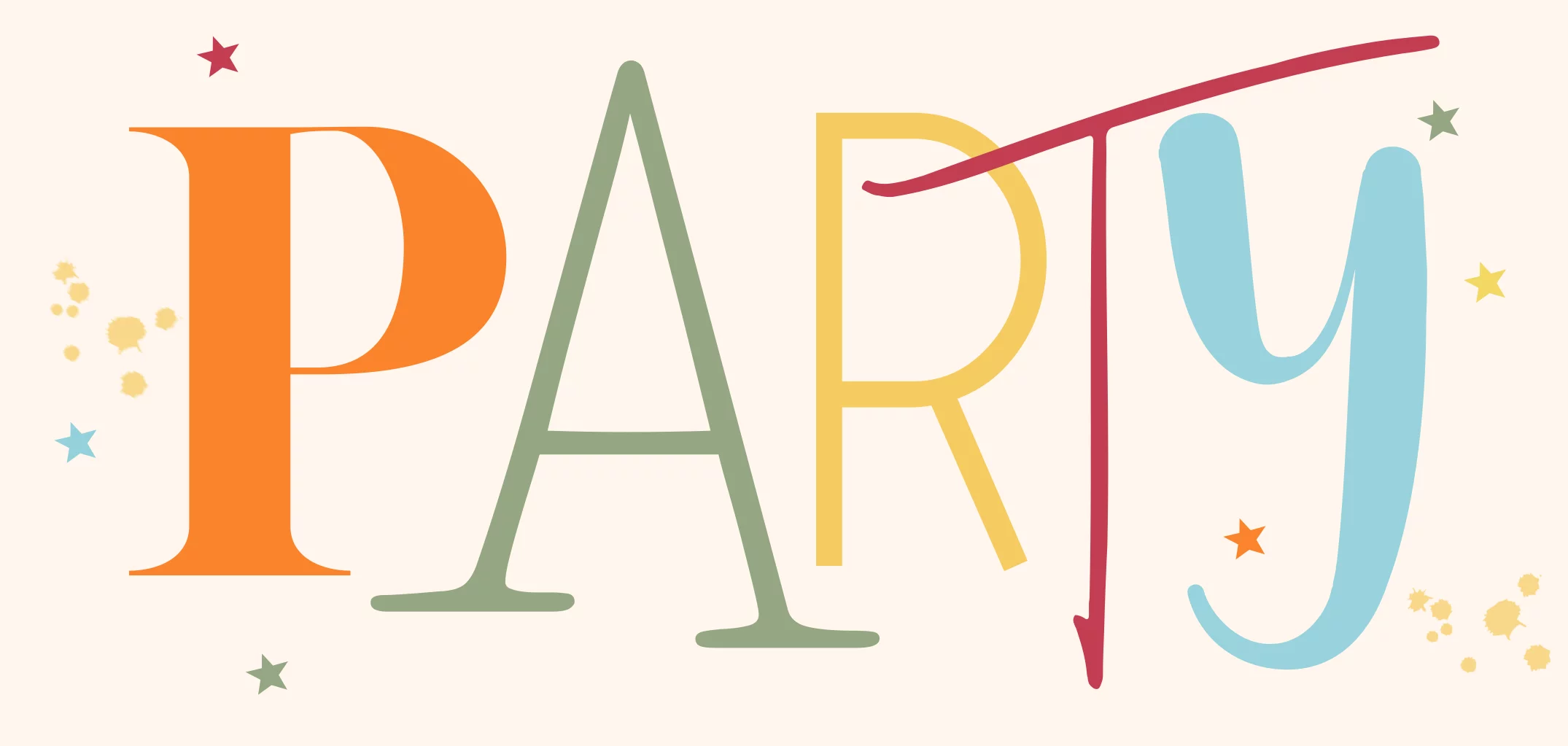 Een vrolijke verjaardagsuitnodiging met gekleurde tekst party. De sterren en inktspetters maken deze uitnodigingskaart af